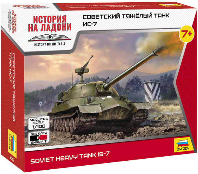 Ragasztást nem igénylő makett. Az IS-7 harckocsi a második világháború nehéz harckocsik fejlődésének megkoronázása volt. A lenyűgöző páncélzat, a nagy teljesítményű ágyú és a közel 70 tonnás járművet 60 km/h sebességre gyorsító motor kombinációjával ez a harckocsi bizonyult a legfejlettebbnek a maga kategóriájában.
