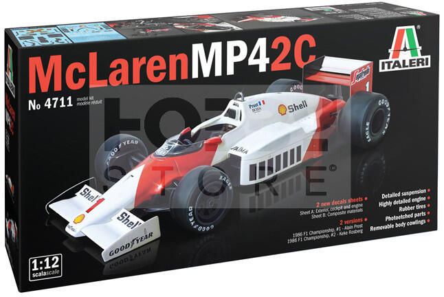 Italeri McLaren MP4/2C Prost-Rosberg 1:24 autó makett 4711IT Makett méretarány: 1:24 Az Italeri makett gyártó cég több mint 60 éve kápráztatja el a makettezni vágyókat műanyag termékeikkel. Történelmi maketteik megalkotását pontos kutatási munkák előzik meg, így válhattak ennyire népszerűvé. Ugyanakkor széles termékpaletta jellemzi őket: a modern gépjárművek szerelm