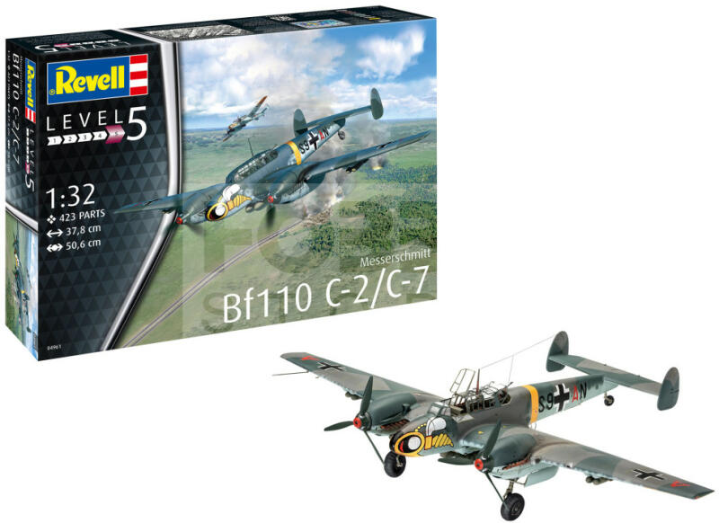 Revell Messerschmitt Bf110 C-7 1:32 repülő makett 04961R Makett méretarány: 1:32 Alkatrész darabszám: 423 Makett hossúság: 37,8 cm Festést és ragasztást igénylő műanyag makett. A szükséges kiegészítőket, mint festék, ragasztó a készlet nem tartalmazza . Gyártó: Revell A Revell tradicionális nagy múltú makett gyártó. Már több mint 60 éve kápráztatja el a rajongóit
