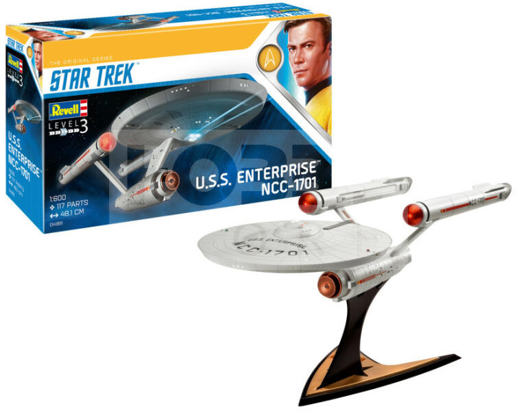 Revell Star Trek U. S. S. Enterprise NCC-1701 (TOS) 1:600 űrhajó makett 04991R Makett méretarány: 1:600 Alkatrész darabszám: 117 Makett hossúság: 48,1 cm Festést és ragasztást igénylő műanyag makett. A szükséges kiegészítőket, mint festék, ragasztó a készlet nem tartalmazza . Gyártó: Revell A Revell tradicionális nagy múltú makett gyártó. Már több mint 60 éve kápr