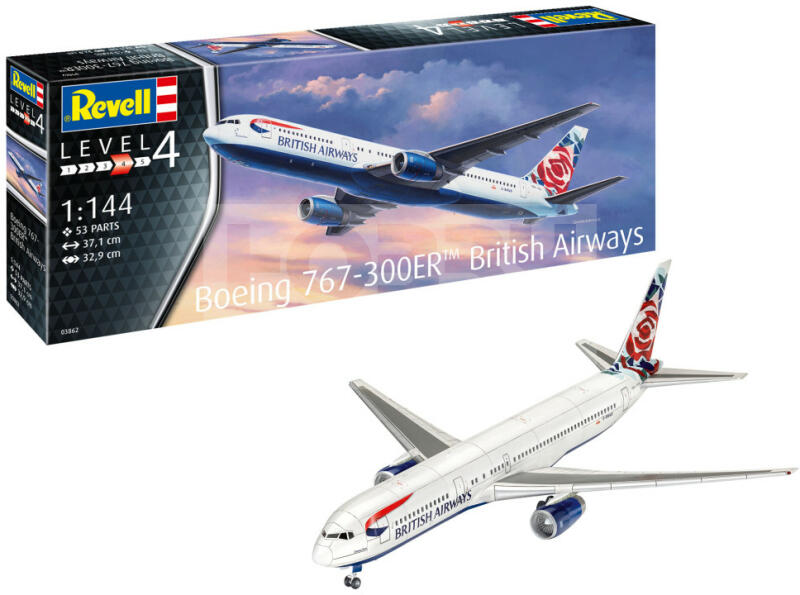 Revell Boeing 767-300ER (Airline TBD) 1:144 repülő makett 03862R Makett méretarány: 1:144 Alkatrész darabszám: 53 Makett hossúság: 37,1 cm Festést és ragasztást igénylő műanyag makett. A szükséges kiegészítőket, mint festék, ragasztó a készlet nem tartalmazza . Gyártó: Revell A Revell tradicionális nagy múltú makett gyártó. Már több mint 60 éve kápráztatja el a ra