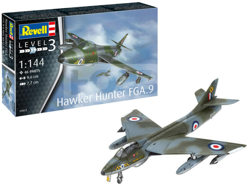 Revell Hawker Hunter FGA. 9 1:144 repülő makett 03833R Makett méretarány: 1:144 Alkatrész darabszám: 46 Makett hossúság: 9,6 cm Festést és ragasztást igénylő műanyag makett. A szükséges kiegészítőket, mint festék, ragasztó a készlet nem tartalmazza . Gyártó: Revell A Revell tradicionális nagy múltú makett gyártó. Már több mint 60 éve kápráztatja el a rajongóit te