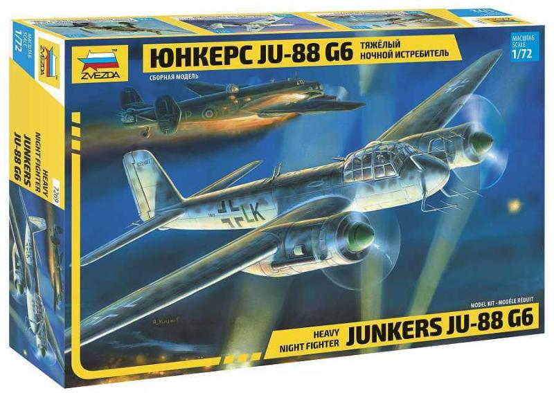 Műanyag modell Zvezda 7269 éjszaka nehéz bombázó Ju-88 G6. 1:72, hossza 22 cm. Kit tartalmaz 65 darab összetapadását.