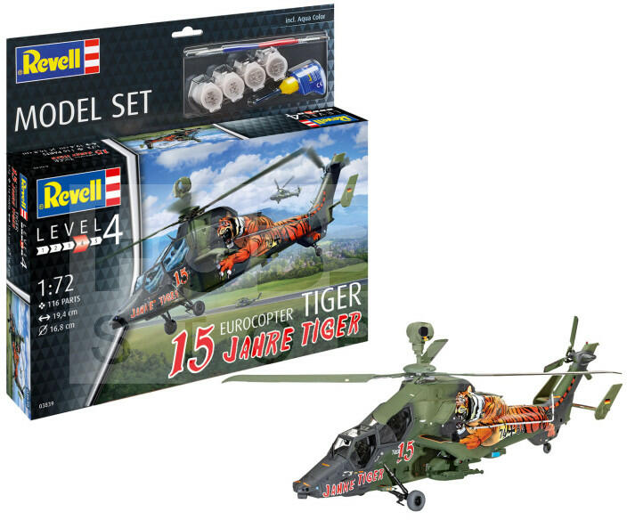 Revell Model Set Eurocopter Tiger - "15 Years Tiger" 1:72 helikopter makett 63839R Makett méretarány: 1:72 Alkatrész darabszám: 116 Makett hossúság: 19,4 cm Festést és ragasztást igénylő műanyag makett. A készlet az alap színeket (Revell Aqua Color), ragasztót illetve ecsetet tartalmaz . Gyártó: Revell A Revell tradicionális nagy múltú makett gyártó. Már több mint 60 éve k