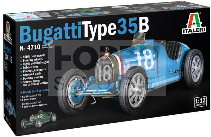 Italeri Bugatti Type 35B 1:12 autó makett 4710IT Makett méretarány: 1:12 Az Italeri makett gyártó cég több mint 60 éve kápráztatja el a makettezni vágyókat műanyag termékeikkel. Történelmi maketteik megalkotását pontos kutatási munkák előzik meg, így válhattak ennyire népszerűvé. Ugyanakkor széles termékpaletta jellemzi őket: a modern gépjárművek szerelmeseitől kez