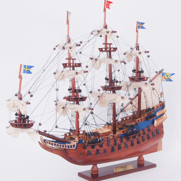 Vasa hajómakett Technikai adatok: MÉRETE: 50 x 17 x 44 magas cm ANYAGA: akácia - más trópusi fák TARTOZÉKOK: a hajómaketthez esztétikus névtáblát és fából készült talpazatot biztosítunk. A talpazatnak köszönhetően, könnyen elhelyezhető a bútoron. CSOMAGOLÁS: a makettet összeszerelve, biztonságos fa védőkeretben és dobozban forgalmazzuk. Az eredeti hajó tulajdonságai