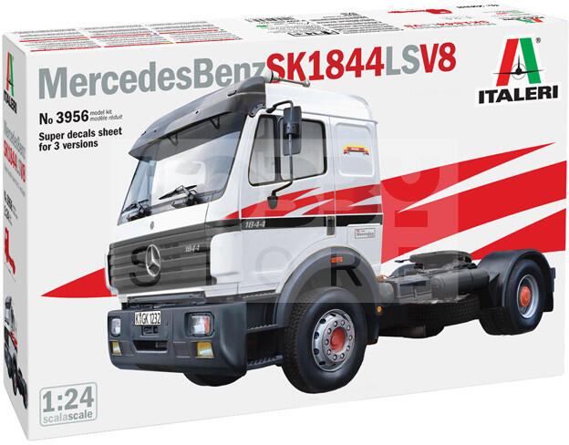 Italeri Mercedes Benz SK 1844 LS V8 1:24 autó makett 3956IT Makett méretarány: 1:24 Az Italeri makett gyártó cég több mint 60 éve kápráztatja el a makettezni vágyókat műanyag termékeikkel. Történelmi maketteik megalkotását pontos kutatási munkák előzik meg, így válhattak ennyire népszerűvé. Ugyanakkor széles termékpaletta jellemzi őket: a modern gépjárművek szerelme