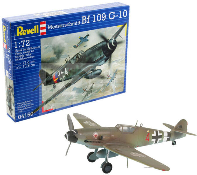 Revell Messerschmitt Bf 109 G-10 1:72 repülő makett 04160R Makett méretarány: 1:72 Alkatrész darabszám: 37 Makett hossúság: 12,6 cm Festést és ragasztást igénylő műanyag makett. A szükséges kiegészítőket, mint festék, ragasztó a készlet nem tartalmazza . Gyártó: Revell A Revell tradicionális nagy múltú makett gyártó. Már több mint 60 éve kápráztatja el a rajongói