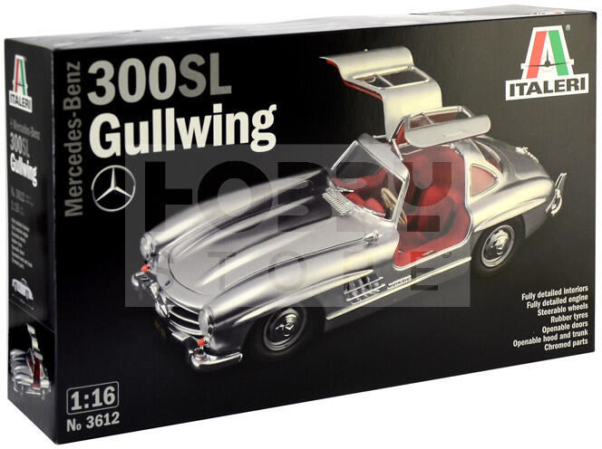 Italeri MERCEDES-BENZ 300 SL GULLWING 1:16 autó makett 3612IT Makett méretarány: 1:16 Az Italeri makett gyártó cég több mint 60 éve kápráztatja el a makettezni vágyókat műanyag termékeikkel. Történelmi maketteik megalkotását pontos kutatási munkák előzik meg, így válhattak ennyire népszerűvé. Ugyanakkor széles termékpaletta jellemzi őket: a modern gépjárművek szerel