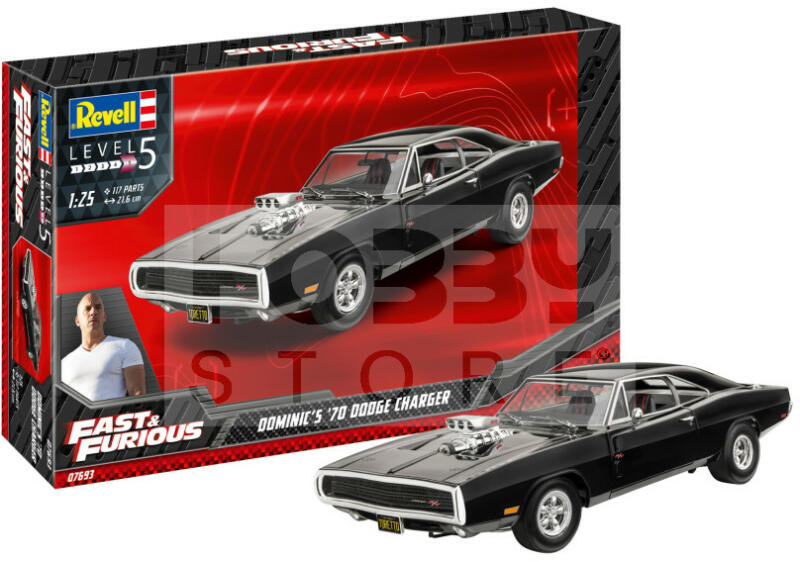 Revell Model Set Fast & Furious - Dominics 1970 Dodge Charger 1:25 autó makett 67693R Makett méretarány: 1:25 Alkatrész darabszám: 117 Makett hossúság: 21,6 cm Festést és ragasztást igénylő műanyag makett. A készlet az alap színeket (Revell Aqua Color), ragasztót illetve ecsetet tartalmaz . Gyártó: Revell A Revell tradicionális nagy múltú makett gyártó. Már több mint 6