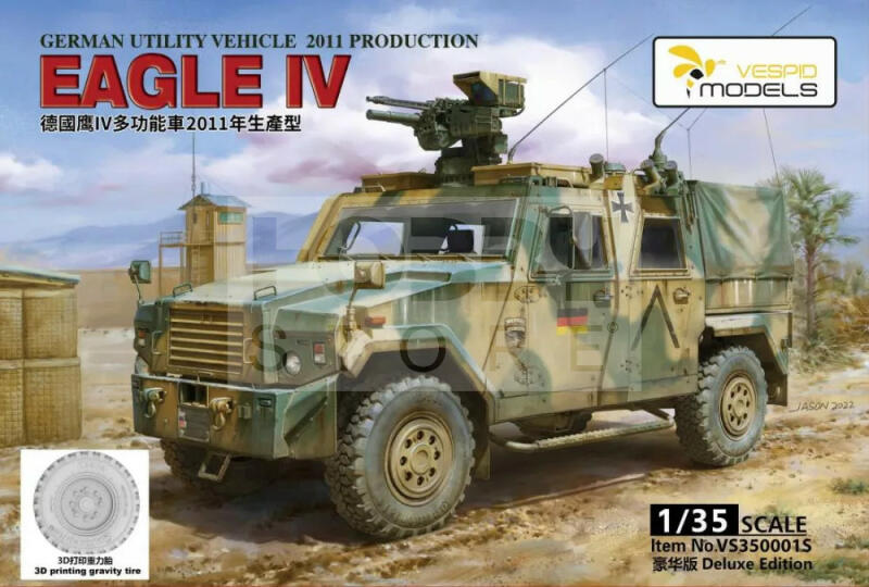 Vespid Models German Eagle IV Utility Vehicle 2011 production (Deluxe edition) makett 1:35 (VS350001S) Makett méretarány: 1:35 Vespid Models makettjeit magas minőség és részletgazdag kidolgozottság jellemzi. Kínálatukban harcjárműveket találhatunk meg változatos méretarányban. Kiváló választás lehet mind kezdők mind profi modellezőknek. Festést és ragasztást igénylő maket