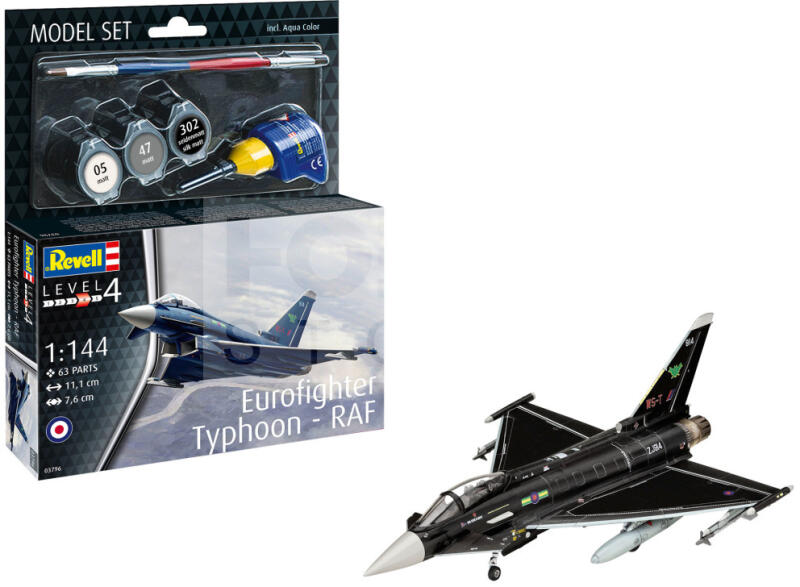 Revell Modellkészlet Eurofighter Typhoon - RAF Repülőgép makett 63796R Makett méretarány: 1:144 Alkatrész darabszám: 63 Makett hossúság: 11,1 cm Festést és ragasztást igénylő műanyag makett. A szükséges kiegészítőket, mint festék, ragasztó a készlet tartalmazza . Eurofighter Typhoon: RAF Edition 1:144 méretarányban Fedezd fel az Eurofighter Typhoon precíz modellkészlet