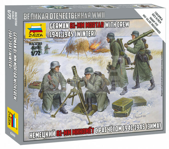 Zvezda German 80 mm Mortar w/Crew makett 1:72 (6209Z) Makett méretarány: 1:72 Alkatrész darabszám: 25 Makett hosszúsága: 2,4 cm A Zvezda a kiváló műanyag modelljei kapcsán vált világszerte ismerté. Makettei a legnépszerűbb méretarányokban érhető el. Elsősorban 2. világháborús gépezetek és kiegészítőik kapcsán érdemes megemlíteni a nevét, de a történelmi makettekb