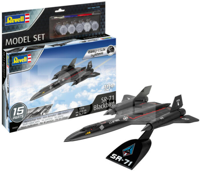 Revell Model Set SR-71 Blackbird 1:110 repülő makett 63652R Makett méretarány: 1:110 Alkatrész darabszám: 16 Makett hossúság: 29,7 cm Festést és ragasztást igénylő műanyag makett. A készlet az alap színeket (Revell Aqua Color), ragasztót illetve ecsetet tartalmaz . Gyártó: Revell A Revell tradicionális nagy múltú makett gyártó. Már több mint 60 éve kápráztatja el a raj