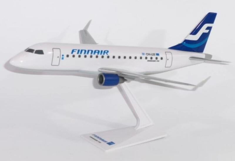 Embraer ERJ170 Finnairrepülőgép modell. Kiváló minőségű műanyag (PPC) repülőgépmodell, melynek alkatrészei ragasztás nélkül illeszthető egymáshoz. Modern nyomdai nyomtatási technológiával gyártva. A modell tartó állvánnyal rendelkezik, futóművek nincsenek. Anyaga: műanyagMérete: 30 cmModelljeink épségét a szállítás előtt ellenőrizzük, majd a dobozt védőzárr