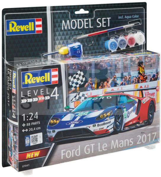 Revell Model Set Ford GT - Le Mans 1:24 autó makett 67041R Makett méretarány: 1:24 Alkatrész darabszám: 88 Makett hossúság: 20,4 cm Festést és ragasztást igénylő műanyag makett. A készlet az alap színeket (Revell Aqua Color), ragasztót illetve ecsetet tartalmaz . Gyártó: Revell A Revell tradicionális nagy múltú makett gyártó. Már több mint 60 éve kápráztatja el a rajong