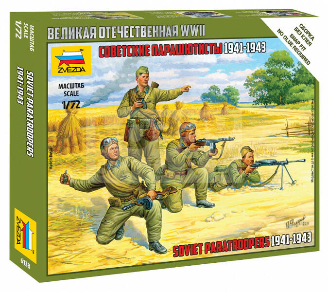 Zvezda Soviet Paratroops makett 1:72 (6138Z) Makett méretarány: 1:72 Alkatrész darabszám: 20 Makett hosszúsága: 2,4 cm A Zvezda a kiváló műanyag modelljei kapcsán vált világszerte ismerté. Makettei a legnépszerűbb méretarányokban érhető el. Elsősorban 2. világháborús gépezetek és kiegészítőik kapcsán érdemes megemlíteni a nevét, de a történelmi makettekből is sz