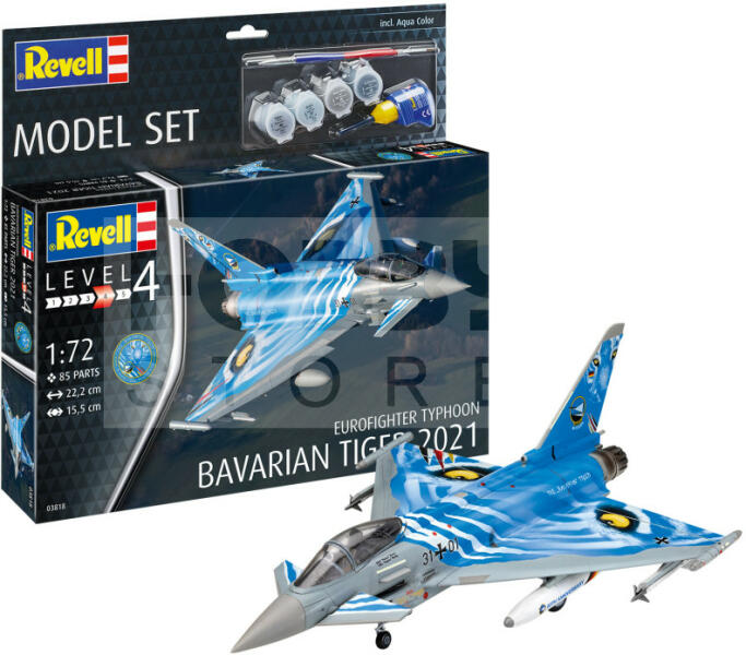 Revell Model Set Eurofighter Typhoon"Bavarian Tiger 2021" 1:72 repülő makett 63818R Makett méretarány: 1:72 Alkatrész darabszám:85 Makett hossúság: 22,2 cm Festést és ragasztást igénylő műanyag makett. A készlet az alap színeket (Revell Aqua Color), ragasztót illetve ecsetet tartalmaz . Gyártó: Revell A Revell tradicionális nagy múltú makett gyártó. Már több mint 60 éve