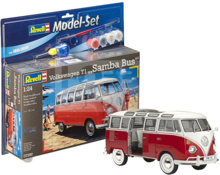 Revell Model Set VW T1 Samba Bus 1:24 autó makett 67399R Makett méretarány: 1:24 Alkatrész darabszám: 173 Makett hossúság: 18,1 cm Festést és ragasztást igénylő műanyag makett. A készlet az alap színeket (Revell Aqua Color), ragasztót illetve ecsetet tartalmaz . Gyártó: Revell A Revell tradicionális nagy múltú makett gyártó. Már több mint 60 éve kápráztatja el a rajong