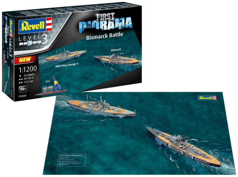 Méret: 1:1200 Életkori ajánlás: 10+ Alkatrészek száma: 76 Szint: 3 Kezdő készlet az első dioráma megtervezéséhez, hogy valósághű környezetben mutassa be az épített modelleket. A HMS King George V & Bismarck történelmi csatahajók készlete 2D dioráma lemez Az alapszíneken kívül ragasztó és ecsetek is járnak hozzá. Tartalom : Műanyag modellkészlet (nincs összeszer