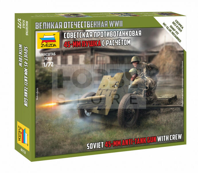 Zvezda Soviet 45 mm Anti-Tank Gun with Crew makett 1:72 (6112Z) Makett méretarány: 1:72 Alkatrész darabszám: 14 Makett hosszúsága: 5,7 cm A Zvezda a kiváló műanyag modelljei kapcsán vált világszerte ismerté. Makettei a legnépszerűbb méretarányokban érhető el. Elsősorban 2. világháborús gépezetek és kiegészítőik kapcsán érdemes megemlíteni a nevét, de a történelmi