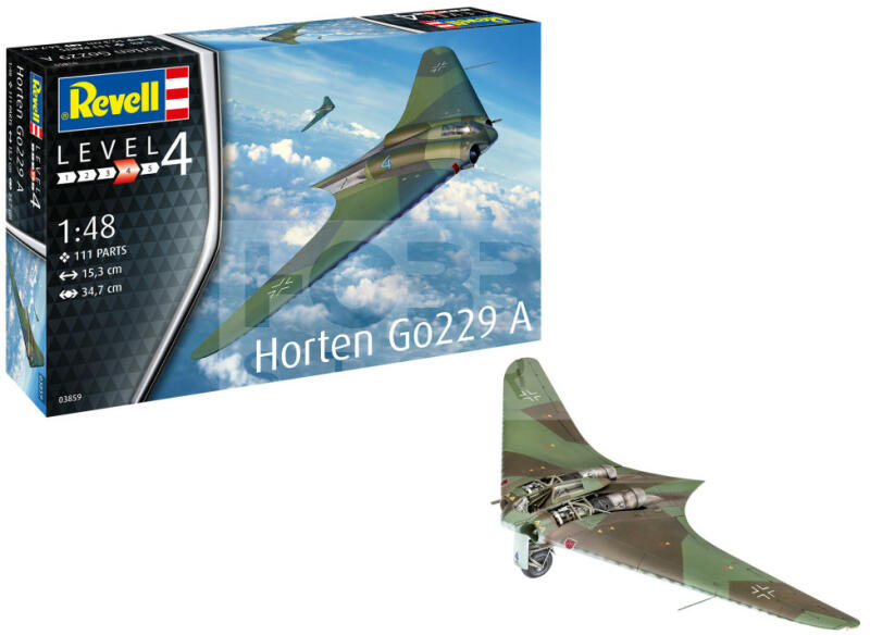 Revell Horten Go229 A-1 1:48 repülő makett 03859R Makett méretarány: 1:48 Alkatrész darabszám: 111 Makett hossúság: 15,3 cm Festést és ragasztást igénylő műanyag makett. A szükséges kiegészítőket, mint festék, ragasztó a készlet nem tartalmazza . Gyártó: Revell A Revell tradicionális nagy múltú makett gyártó. Már több mint 60 éve kápráztatja el a rajongóit termé