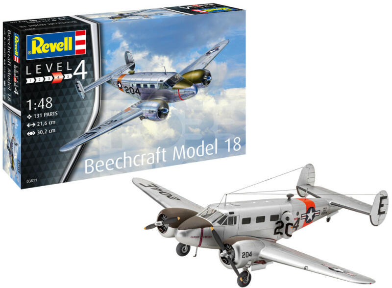 Revell Beechcraft Model 18 1:48 repülő makett 03811R Makett méretarány: 1:48 Alkatrész darabszám: 129 Makett hossúság: 21,6 cm Festést és ragasztást igénylő műanyag makett. A szükséges kiegészítőket, mint festék, ragasztó a készlet nem tartalmazza . Gyártó: Revell A Revell tradicionális nagy múltú makett gyártó. Már több mint 60 éve kápráztatja el a rajongóit ter