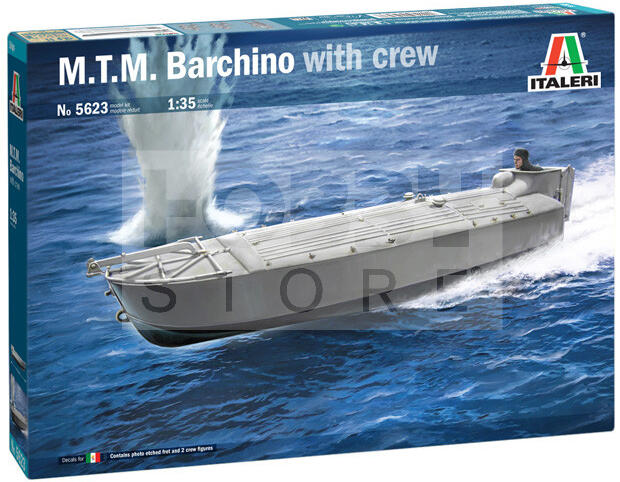 Italeri M. T. M. Barchino with crew 1:35 hajó makett 5623IT Makett méretarány: 1:35 Az Italeri makett gyártó cég több mint 60 éve kápráztatja el a makettezni vágyókat műanyag termékeikkel. Történelmi maketteik megalkotását pontos kutatási munkák előzik meg, így válhattak ennyire népszerűvé. Ugyanakkor széles termékpaletta jellemzi őket: a modern gépjárművek szerelme