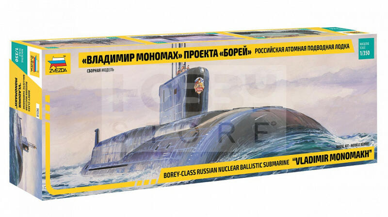 Zvezda SSBN Borey Nuc. Submarine makett 1:350 (9058Z) Makett méretarány: 1:350 Alkatrész darabszám: 100 Makett hosszúsága: 48,6 cm A Zvezda a kiváló műanyag modelljei kapcsán vált világszerte ismerté. Makettei a legnépszerűbb méretarányokban érhető el. Elsősorban 2. világháborús gépezetek és kiegészítőik kapcsán érdemes megemlíteni a nevét, de a történelmi makette