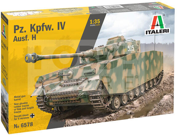Italeri Pz. Kpfw. IV Ausf. H 1:35 harcjármű makett 6578IT Makett méretarány: 1:35 Az Italeri makett gyártó cég több mint 60 éve kápráztatja el a makettezni vágyókat műanyag termékeikkel. Történelmi maketteik megalkotását pontos kutatási munkák előzik meg, így válhattak ennyire népszerűvé. Ugyanakkor széles termékpaletta jellemzi őket: a modern gépjárművek szerelmes