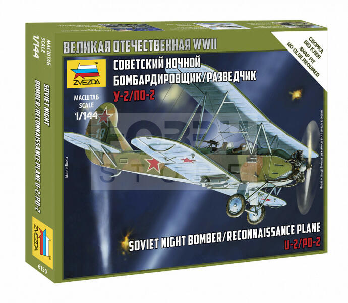 Zvezda Soviet Plane PO-2 makett 1:144 (6150Z) Makett méretarány: 1:144 Alkatrész darabszám: 10 Makett hosszúsága: 5,6 cm A Zvezda a kiváló műanyag modelljei kapcsán vált világszerte ismerté. Makettei a legnépszerűbb méretarányokban érhető el. Elsősorban 2. világháborús gépezetek és kiegészítőik kapcsán érdemes megemlíteni a nevét, de a történelmi makettekből is s