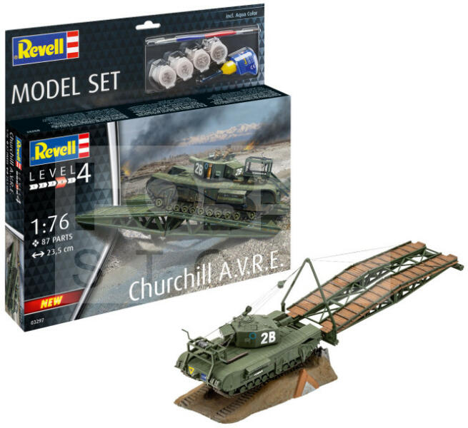 Revell Model Set Churchill A. V. R. E. 1:76 harcjármű makett 63297R Makett méretarány: 1:76 Alkatrész darabszám: 87 Makett hossúság: 23,5 cm Festést és ragasztást igénylő műanyag makett. A készlet az alap színeket (Revell Aqua Color), ragasztót illetve ecsetet tartalmaz . Gyártó: Revell A Revell tradicionális nagy múltú makett gyártó. Már több mint 60 éve kápráztatja e