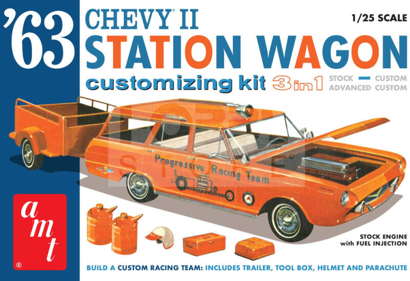AMT 1963 CHEVY II STATION WAGON W/TRAILER 1:25 autó makett AMT1201 Szeretenél egy igazi amerikai izomautót építeni? Nos, az AMT makettek széles palettáján szinte csak ilyeneket fogsz találni. Az AMT amerikai makett gyártó mely kifejezetten autó makettek gyártásával foglalkozik az 30-60 évektől indulva napjainkig. Az autók mellett természetesen megjelennek a szortimentben a Star