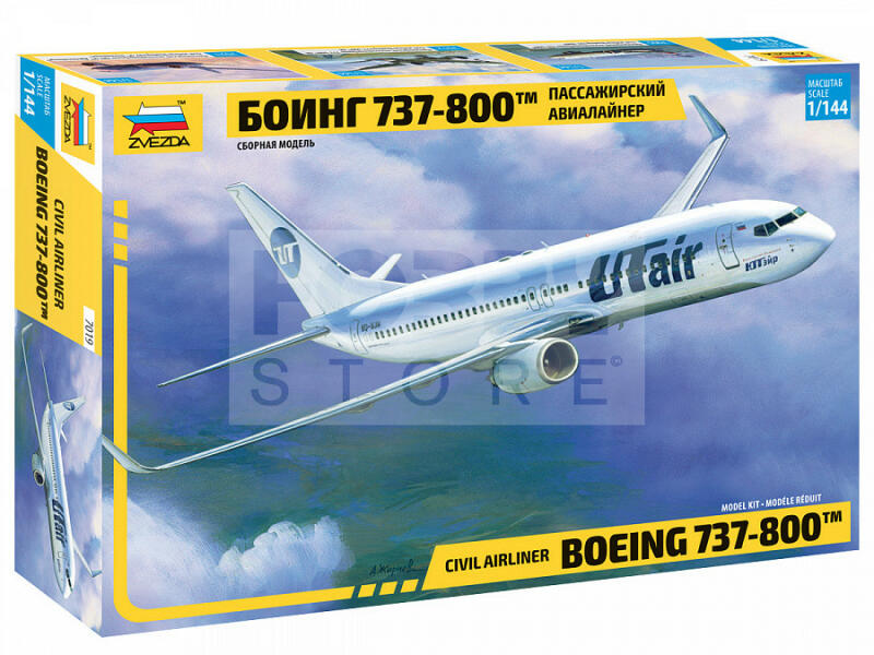 Zvezda Boeing 737-800 makett 1:144 (7019Z) Makett méretarány: 1:144 Alkatrész darabszám: 109 Makett hosszúsága: 27,4 cm A Zvezda a kiváló műanyag modelljei kapcsán vált világszerte ismerté. Makettei a legnépszerűbb méretarányokban érhető el. Elsősorban 2. világháborús gépezetek és kiegészítőik kapcsán érdemes megemlíteni a nevét, de a történelmi makettekből is sz