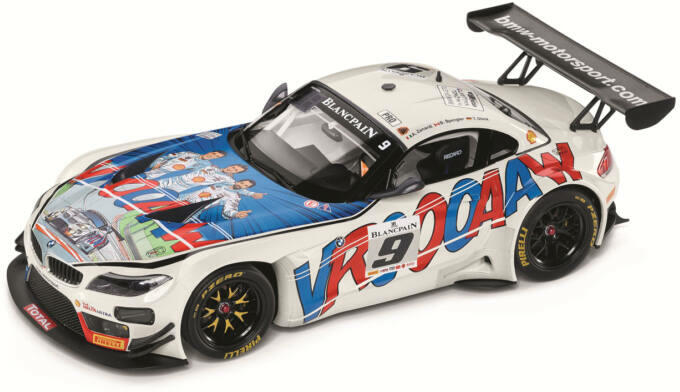 BMW Z4 GT3 MODELLAUTÓ, A GYÁR ÁLTAL FORGALMAZOTT TERMÉK Ezt a versenyautót 2015-ben használták a Spa 24 órás versenyén. A sofőrök Zanardi, Glock és Spengler voltak. A festés tisztelgés a jól ismert belga képregény sorozat, a MICHEL VAILLANT számára. Ennél a modellautónál nem nyithatóak az ajtók, a gépháztető és a csomagtértető. A modell kormányozható első kerekekk