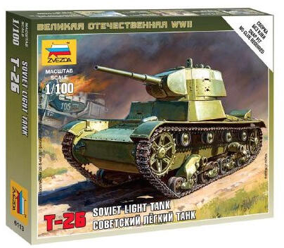 Festést, ragasztást igénylő makett. Szovjet T26-os könnyű tank Méretarány: 1:100 Gyártó: Zvezda
