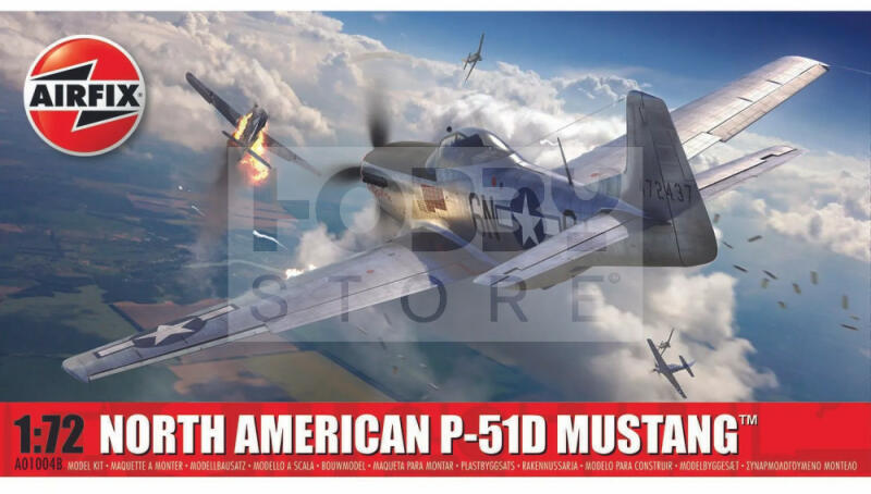 Airfix North American P-51D Mustang repülőgép makett 1:72 (A01004) Makett méretarány: 1:72 Alkatrész darabszám: 53 Makett hossúság: 13,6 cm Festést és ragasztást igénylő műanyag makett. A szükséges kiegészítőket, mint festék, ragasztó a készlet nem tartalmazza . Gyártó: Airfix Az Airfix egy tradicionális brit fröccsöntött műanyag makett gyártó cég. Az Egyesült Kir