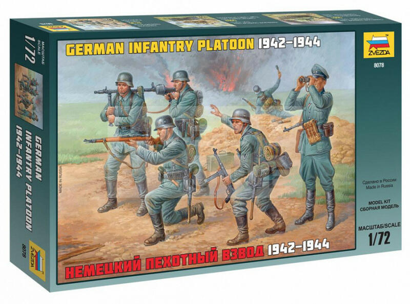 Zvezda German Infantry WWII makett 1:72 (8078Z) Makett méretarány: 1:72 Alkatrész darabszám: 35 Makett hosszúsága: 2 cm A Zvezda a kiváló műanyag modelljei kapcsán vált világszerte ismerté. Makettei a legnépszerűbb méretarányokban érhető el. Elsősorban 2. világháborús gépezetek és kiegészítőik kapcsán érdemes megemlíteni a nevét, de a történelmi makettekből is sz