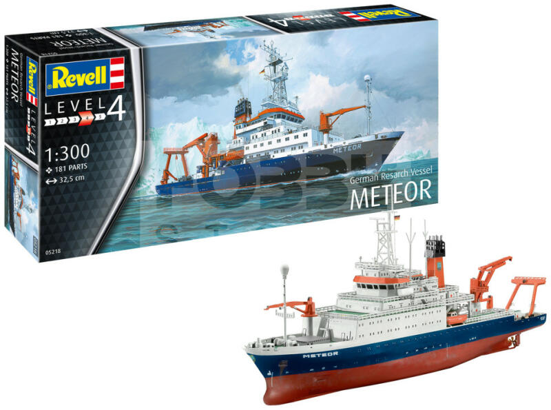 Revell German Research Vessel Meteor 1:300 hajó makett 05218R Makett méretarány: 1:300 Alkatrész darabszám: 181 Makett hossúság: 32,5 cm Festést és ragasztást igénylő műanyag makett. A szükséges kiegészítőket, mint festék, ragasztó a készlet nem tartalmazza . Gyártó: Revell A Revell tradicionális nagy múltú makett gyártó. Már több mint 60 éve kápráztatja el a rajon