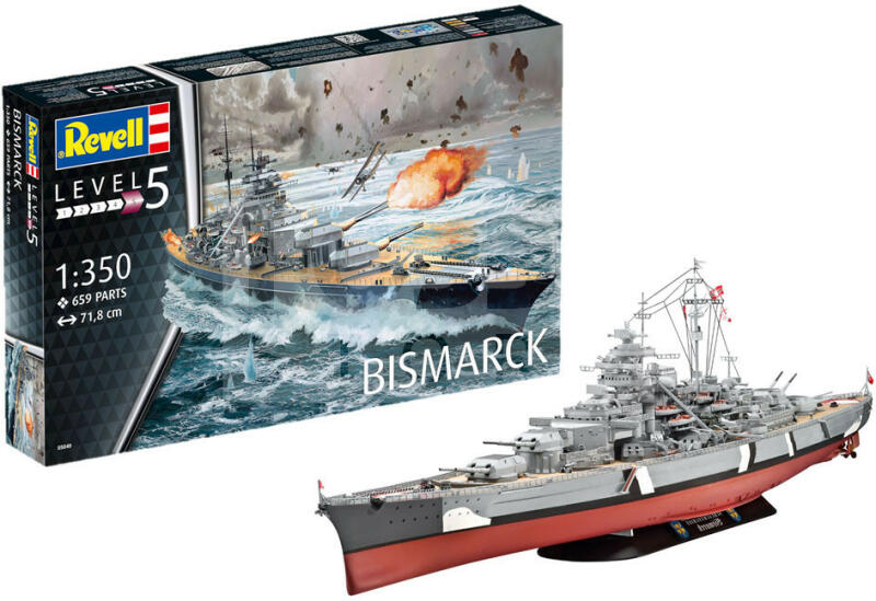 Revell Battleship Bismarck 1:350 hajó makett 05040R Makett méretarány: 1:350 Alkatrész darabszám: 659 Makett hossúság: 71,8 cm Festést és ragasztást igénylő műanyag makett. A szükséges kiegészítőket, mint festék, ragasztó a készlet nem tartalmazza . Gyártó: Revell A Revell tradicionális nagy múltú makett gyártó. Már több mint 60 éve kápráztatja el a rajongóit term