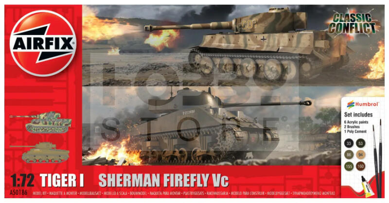 Airfix - Starter Set - Classic Conflict Tiger 1 vs Sherman Firefly harcjármű makett 1:72 (A50186) Makett méretarány: 1:72 Alkatrész darabszám: 70 Makett hossúság: 11,8 cm Festést és ragasztást igénylő műanyag makett. A szükséges kiegészítőket, mint festék, ragasztó a készlet tartalmazza . Gyártó: Airfix Az Airfix egy tradicionális brit fröccsöntött műanyag makett gyár