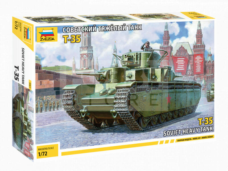Zvezda Soviet Heavy Tank T-35 makett 1:72 (5061Z) Makett méretarány: 1:72 Alkatrész darabszám: 237 Makett hosszúsága: 13,5 cm A Zvezda a kiváló műanyag modelljei kapcsán vált világszerte ismerté. Makettei a legnépszerűbb méretarányokban érhető el. Elsősorban 2. világháborús gépezetek és kiegészítőik kapcsán érdemes megemlíteni a nevét, de a történelmi makettekből