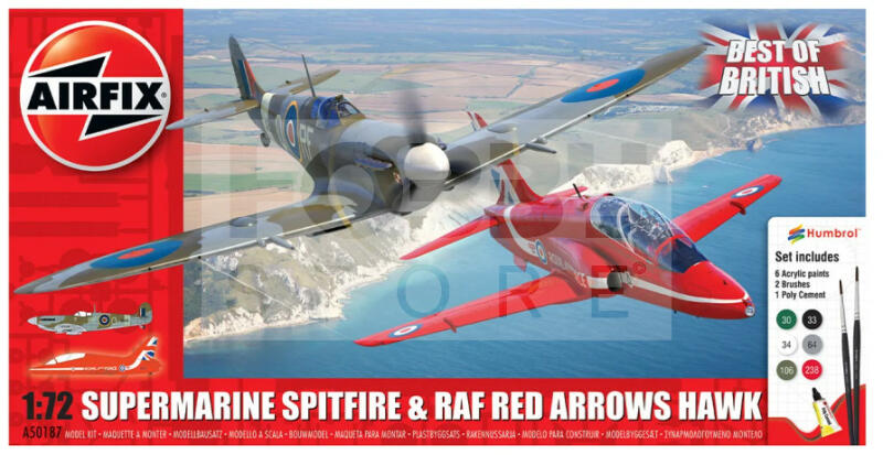 Airfix - Starter Set - Best of British Spitfire and Hawk repülőgép makett 1:72 (A50187) Makett méretarány: 1:72 Alkatrész darabszám: 50 Makett hossúság: 15,5 cm Festést és ragasztást igénylő műanyag makett. A szükséges kiegészítőket, mint festék, ragasztó a készlet tartalmazza . Gyártó: Airfix Az Airfix egy tradicionális brit fröccsöntött műanyag makett gyártó cég.