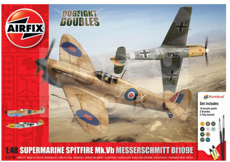 Airfix - Starter Set - Spitfire Mk. Ia Messerschmitt Bf109E-4 Dogfight Double repülőgép makett 1:48 (A50160) Makett méretarány: 1:48 Alkatrész darabszám: 258 Makett hossúság: 19,5 cm Festést és ragasztást igénylő műanyag makett. A szükséges kiegészítőket, mint festék, ragasztó a készlet tartalmazza . Gyártó: Airfix Az Airfix egy tradicionális brit fröccsöntött műanyag