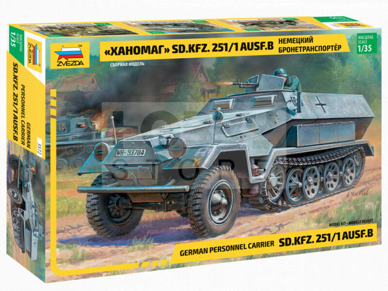 Zvezda Hanomag Sd. Kfz. - 251/1 Ausf B German personnel carrier makett 1:35 (3572Z) Makett méretarány: 1:35 Alkatrész darabszám: 344 Makett hosszúsága: 17 cm A Zvezda a kiváló műanyag modelljei kapcsán vált világszerte ismerté. Makettei a legnépszerűbb méretarányokban érhető el. Elsősorban 2. világháborús gépezetek és kiegészítőik kapcsán érdemes megemlíteni a nevét