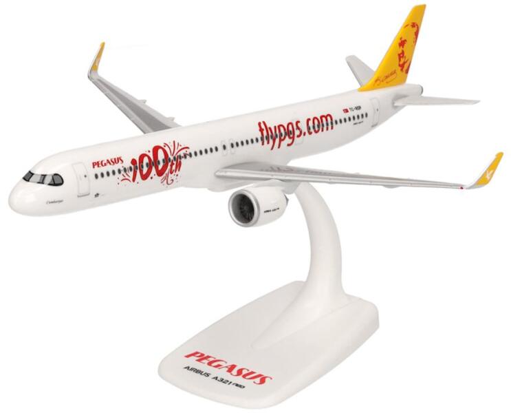 Herpa Snap-fit Airbus A321 NEO Pegasus Airlines 100th Cumhuriyetrepülőgép modell. Kiváló minőségű műanyag (PPC) repülőgépmodell, melynek alkatrészei ragasztás nélkül illeszthető egymáshoz. Modern nyomdai nyomtatási technológiával gyártva. A modell tartó állvánnyal rendelkezik, futóművek nincsenek. Anyaga: műanyagMérete: 22,3 cmModelljeink épségét a szállítás elő
