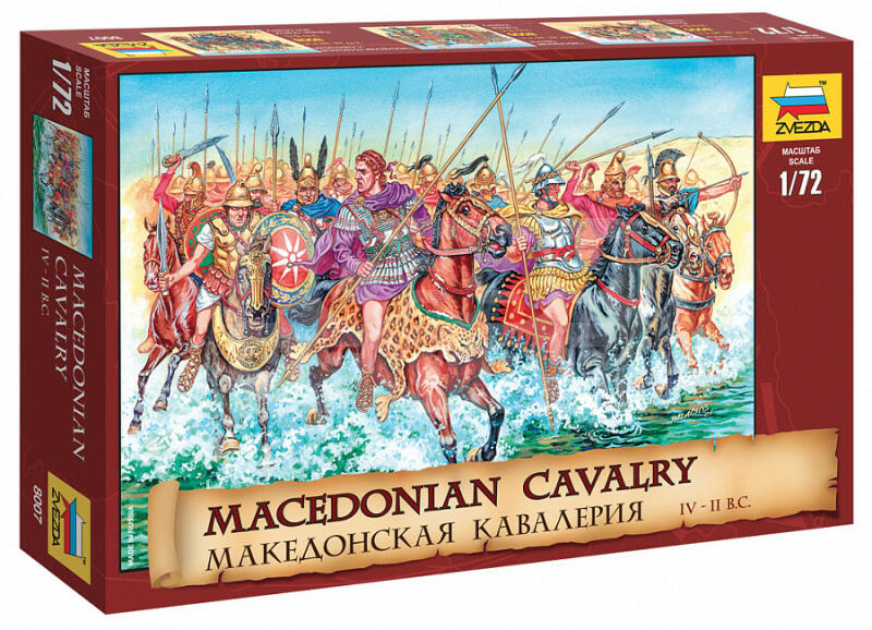 Zvezda Macedonian Cavalry makett 1:72 (8007Z) Makett méretarány: 1:72 Alkatrész darabszám: 17 Makett hosszúsága: 3,5 cm A Zvezda a kiváló műanyag modelljei kapcsán vált világszerte ismerté. Makettei a legnépszerűbb méretarányokban érhető el. Elsősorban 2. világháborús gépezetek és kiegészítőik kapcsán érdemes megemlíteni a nevét, de a történelmi makettekből is sz