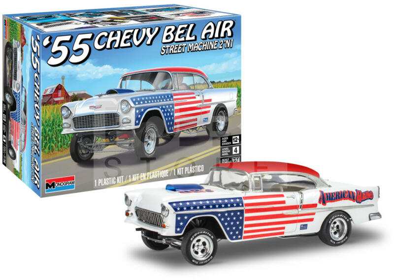 Revell - ’55 Chevy Bel Air Street Machine - (1:24) autó makett 14519R Makett méretarány: 1:24 Alkatrész darabszám: 92 Hosszúság: 200 mm Szélesség: 98 mm Magasság: 70 mm Festést és ragasztást igénylő méretarányos műanyag makett. A szükséges kiegészítőket, mint festék, ragasztó a készlet nem tartalmazza . Gyártó: Revell A Revell tradicionális nagy múltú makett gyárt