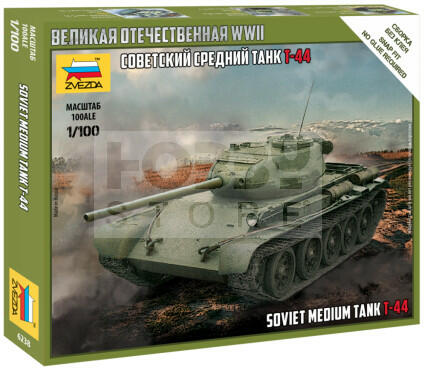 Zvezda T-44 Soviet Tank makett 1:100 (6238Z) Makett méretarány: 1:100 Alkatrész darabszám: 12 Makett hosszúsága: 7 cm A Zvezda a kiváló műanyag modelljei kapcsán vált világszerte ismerté. Makettei a legnépszerűbb méretarányokban érhető el. Elsősorban 2. világháborús gépezetek és kiegészítőik kapcsán érdemes megemlíteni a nevét, de a történelmi makettekből is szé