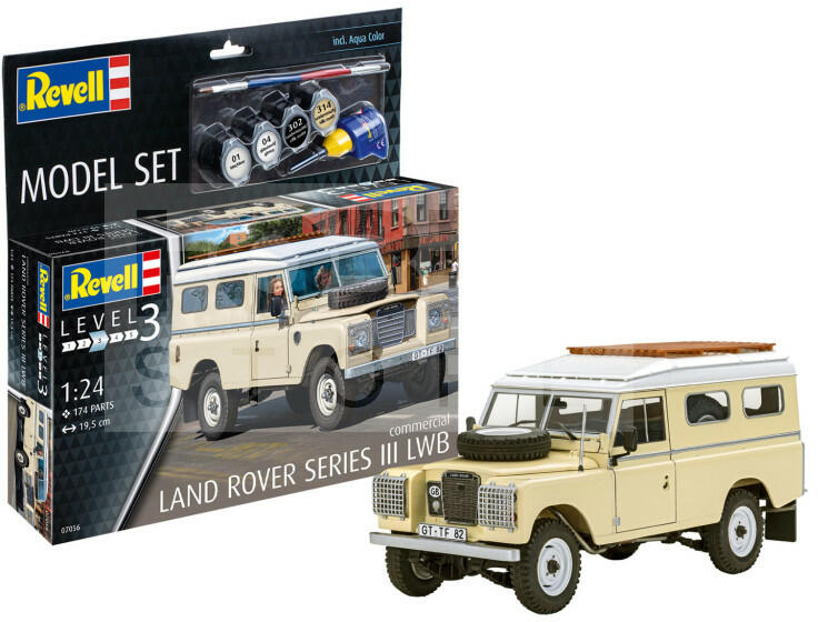 Revell Gift Set Land Rover Series III LWB 1:24 autó makett 67056R Makett méretarány: 1:24 Alkatrész darabszám: 194 Makett hosszúság: 19,4 cm Festést és ragasztást igénylő műanyag makett. A készlet az alap színeket (Revell Aqua Color), ragasztót illetve ecsetet tartalmaz . Gyártó: Revell A Revell tradicionális nagy múltú makett gyártó. Már több mint 60 éve kápráztatja el